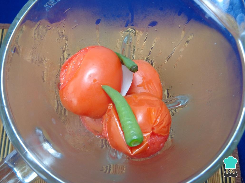 Una vez cocidos los ingredientes para nuestra salsa los llevamos a la licuadora, añadimos una pizca de sal y pimienta, entonces procedemos a licuar hasta obtener una salsa homogénea para la torta de chilaquiles.