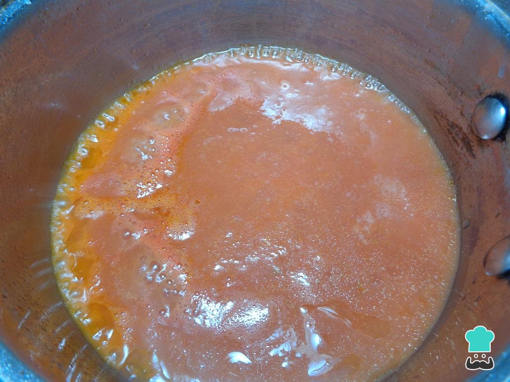 Una vez formada nuestra salsa la vertemos sobre una cacerola con aceite previamente calentado y dejamos que se fría hasta que ya no se observe la natilla. Revisamos el sazón y si hace falta añadimos un poco más de sal y pimienta.