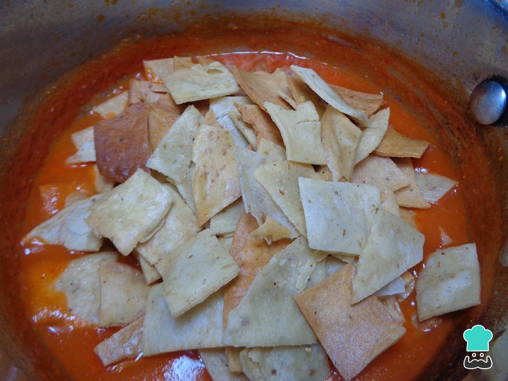 Una vez lista nuestra salsa le añadimos los totopos de maíz y dejamos que se cubran completamente.