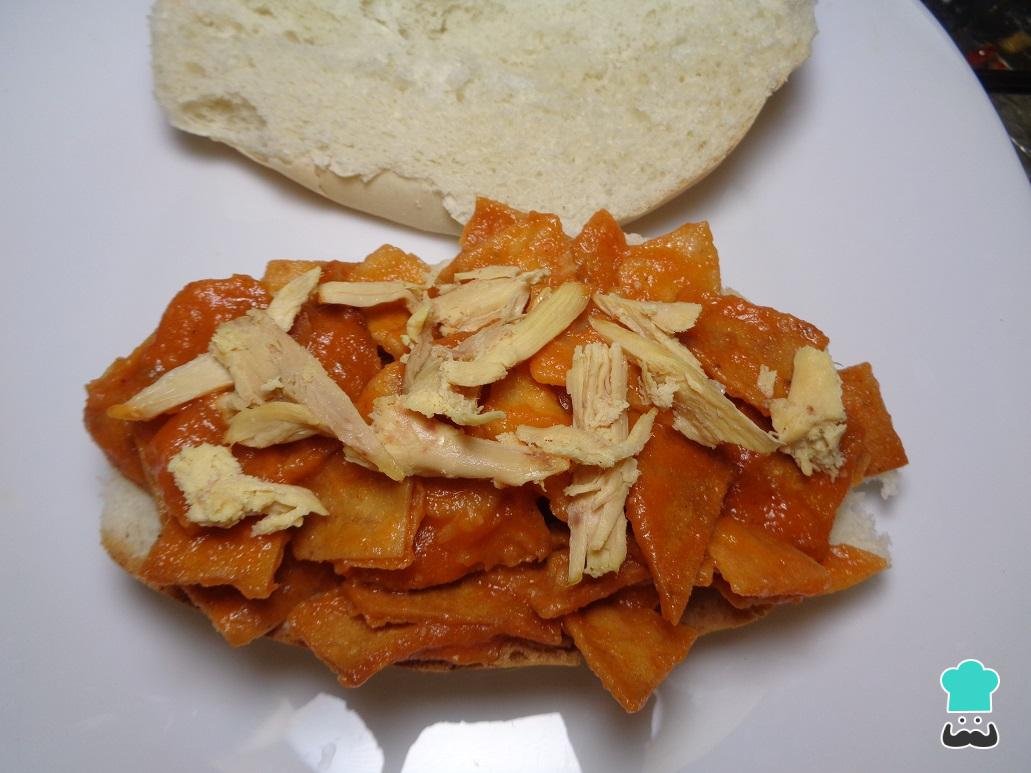 Por otro lado, abrimos por la mitad nuestro pan bolillo, tomamos un poco de los chilaquiles para rellenarlo, y añadimos también un poco de pollo deshebrado.