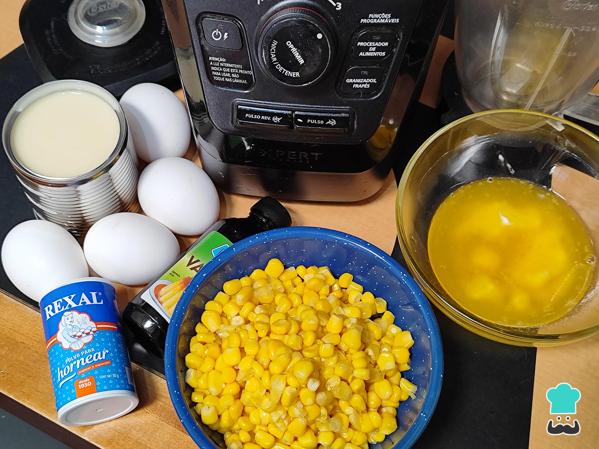 Licúa todos los ingredientes: los granos de elote, los huevos, la leche condensada, la mantequilla derretida, el polvo para hornear, la esencia de vainilla y la sal.