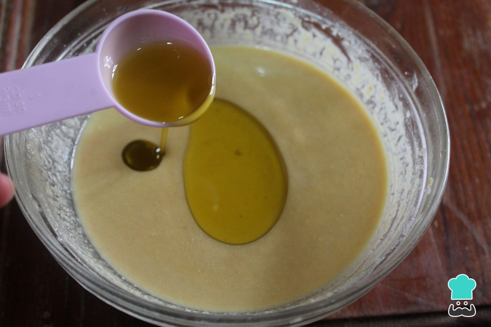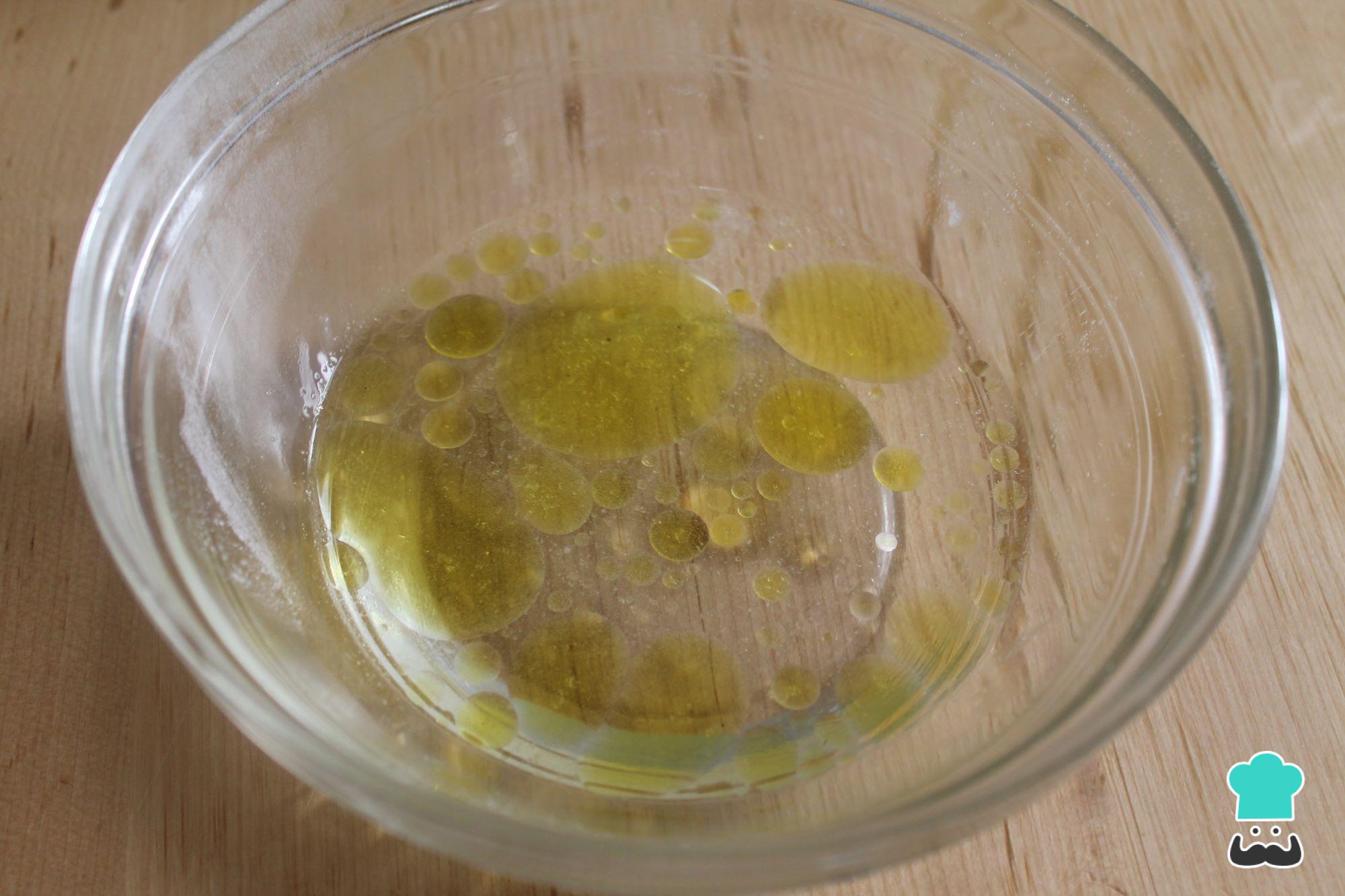Mientras el horno se calienta, retira el papel film de la masa y añade las otras dos cucharadas de aceite de oliva y remueve bien para que se integre.