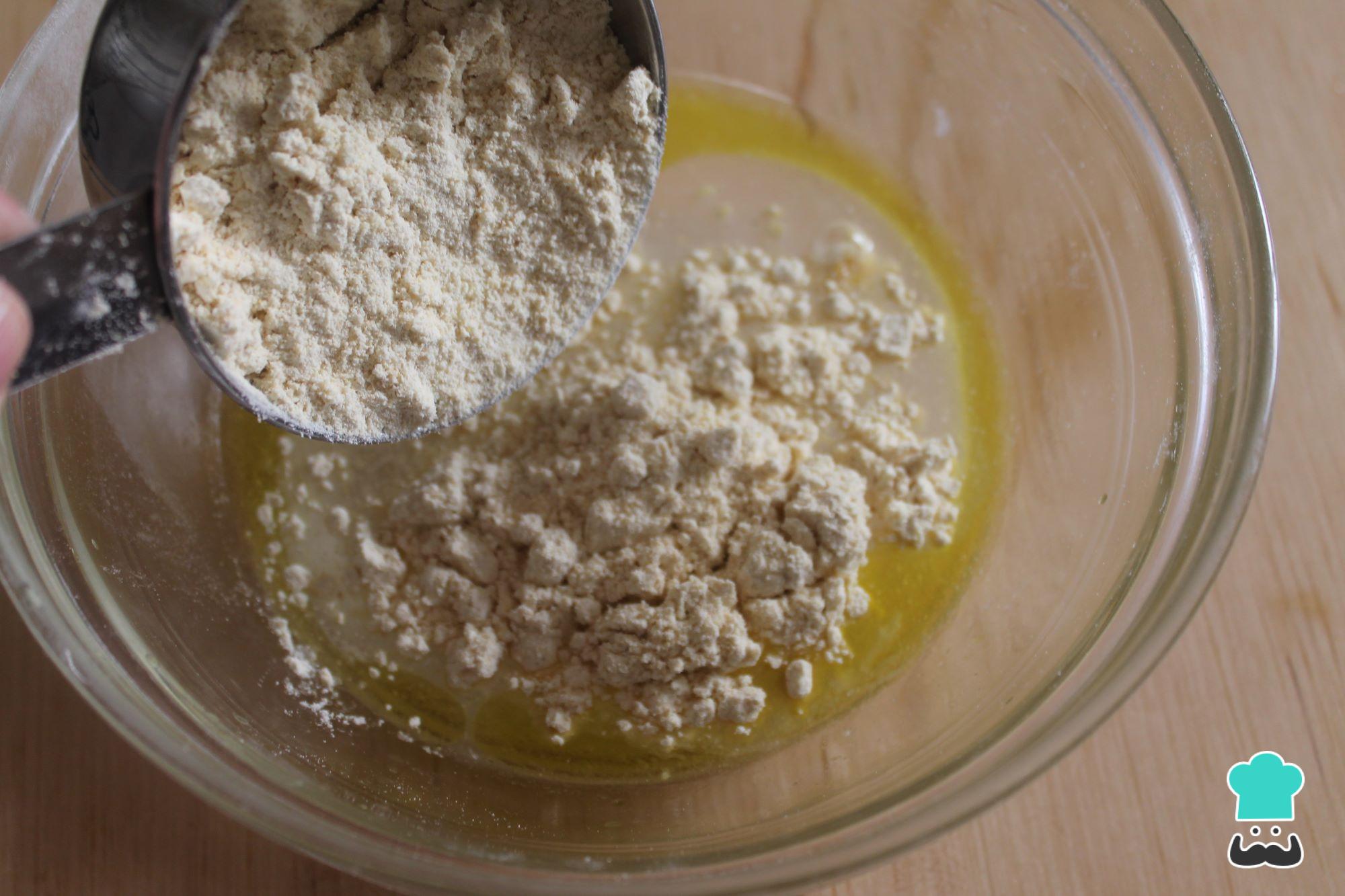 Para hacer la receta de torta de garbanzos, pon en un bol la taza de agua templada con un poco de sal y dos cucharadas de aceite de oliva. Mezcla todo removiendo con una cuchara.