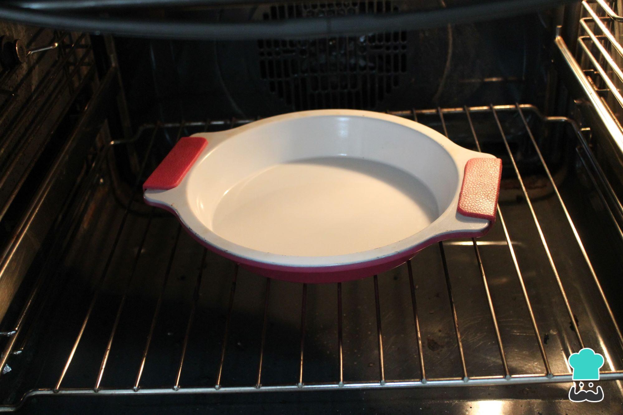 Pasado el tiempo de reposo, precalienta el horno a 200º C. Mete dentro del horno una tartera o una sartén apta para el horno vacía de unos 18-20 cm de diámetro para que se vaya calentando.