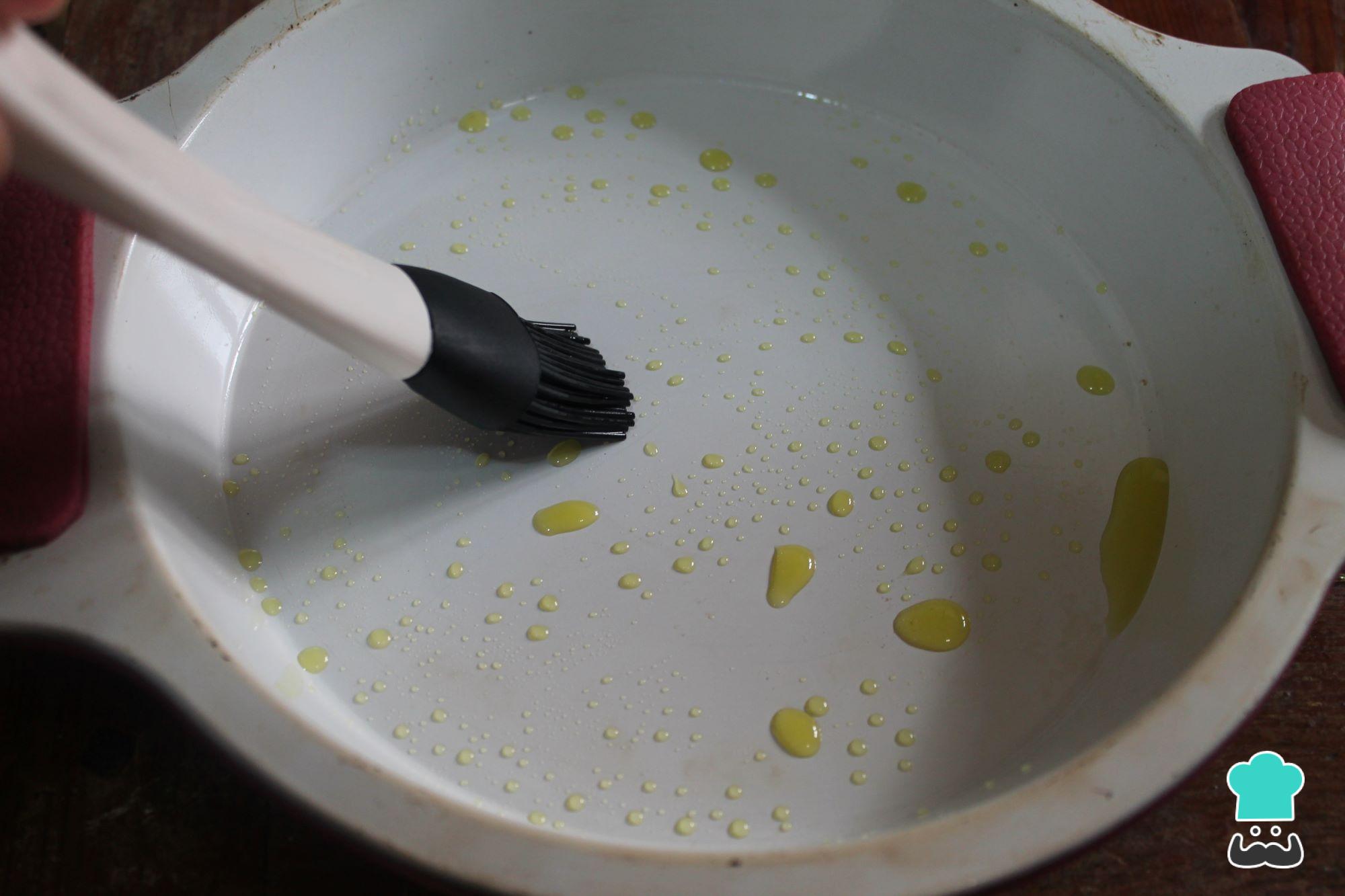 Retira el molde ya caliente del horno, añade unas gotitas de aceite de oliva y pincela toda la superficie con el aceite para que la torta con harina de garbanzos no se pegue al molde.