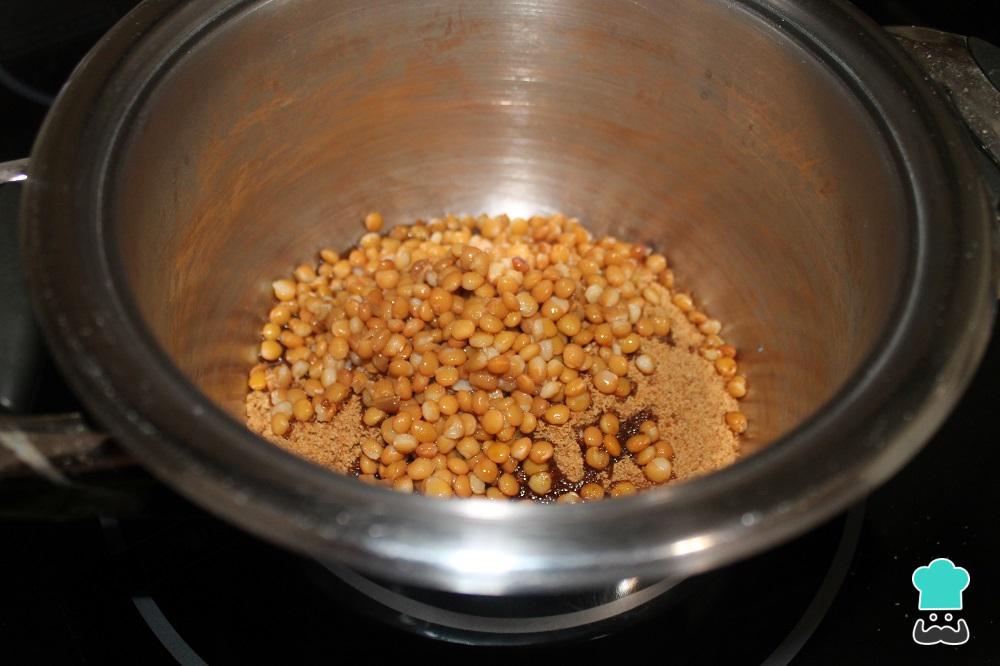 En un cazo ponemos el azúcar panela junto con las lentejas y la vainilla líquida y dejamos cocer 10 minutos una vez que han empezado a hervir, removiendo de vez en cuando.