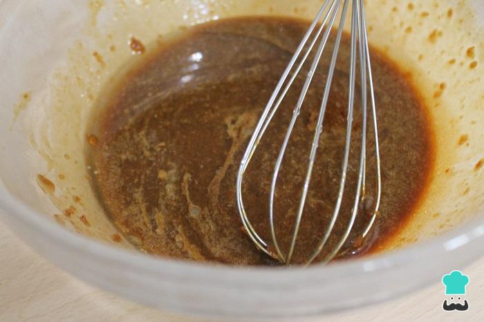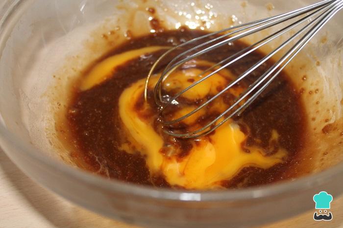 Separamos las claras de las yemas, reservamos las claras y añadimos las yemas a la mezcla de la confitura de lentejas y el aceite. Mezclamos bien.