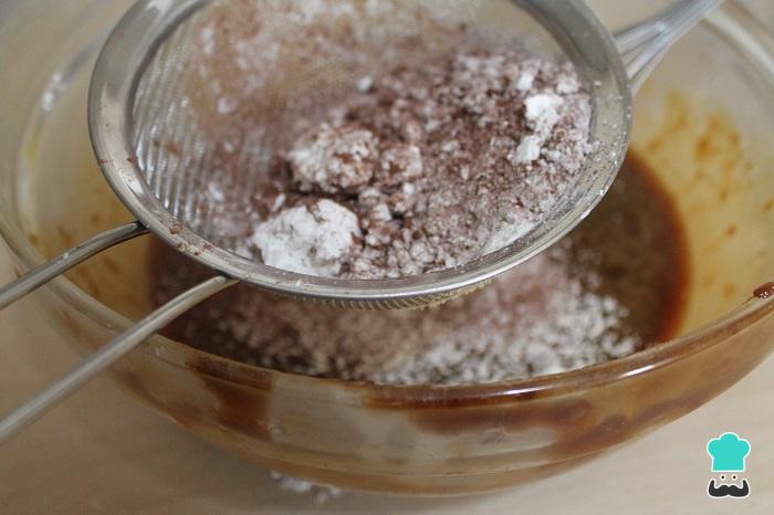 Tamizamos la maicena junto con el cacao en polvo mientras vamos mezclando encima de la mezcla de la torta de lentejas.