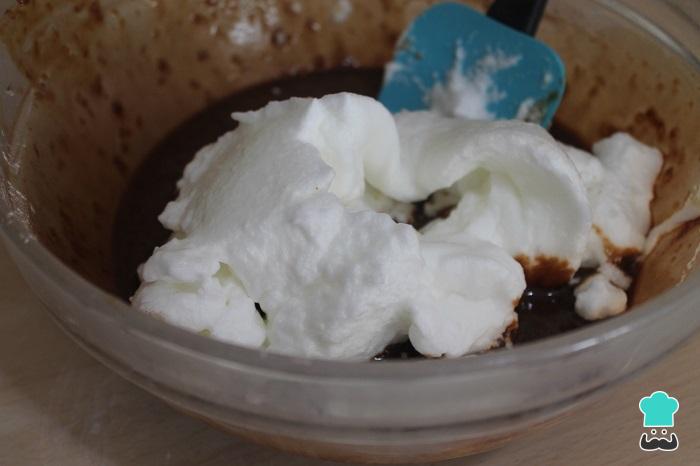 Montamos las claras a punto de nieve junto a una pizca de sal y las incorporamos a la mezcla de la tarta de lentejas poco a poco y con movimientos envolventes.