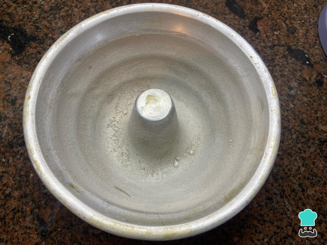 En primer lugar enciende el horno para precalentarlo a 160 °C. Luego, unta con aceite el molde y espolvorea con maicena. En este caso, utilizamos un moldo tipo savarín de 20 cm de diámetro.
