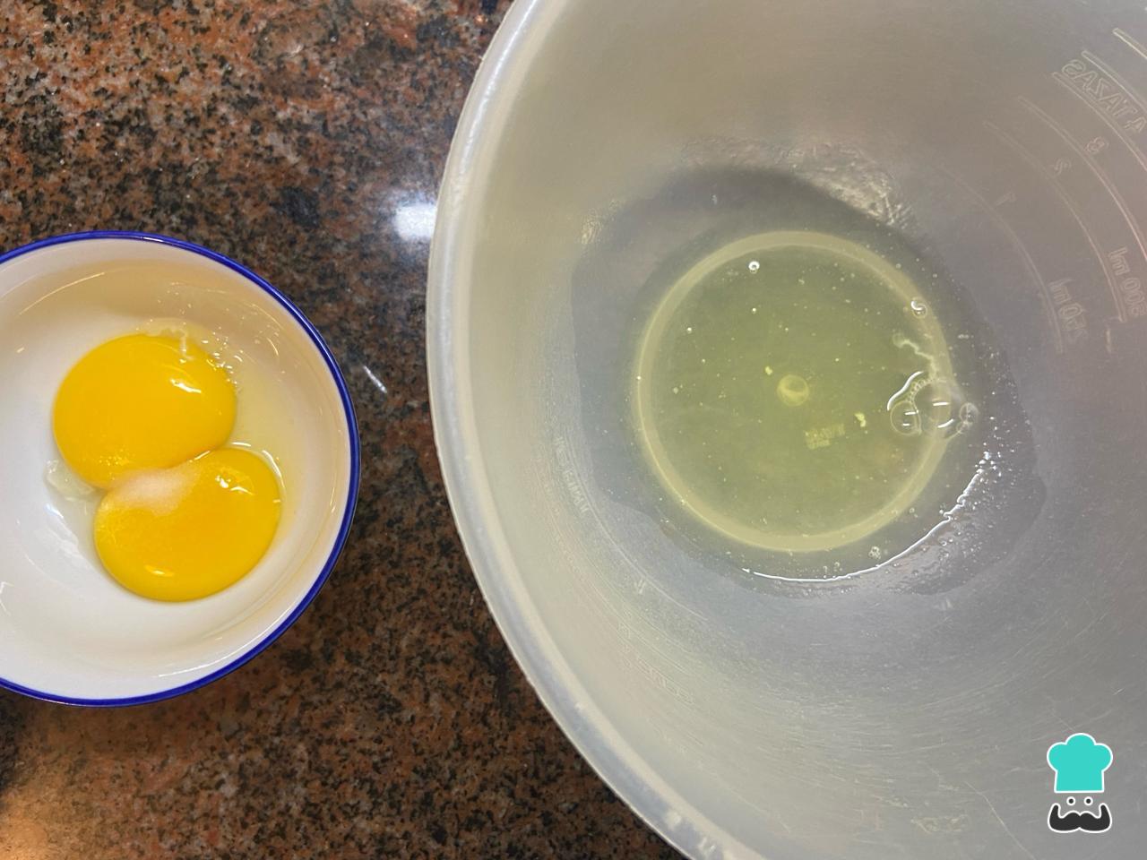Para comenzar con la preparación del bizcocho de maicena esponjoso, separa las claras de las yemas de los huevos. Reserva las yemas y coloca las claras en el bol de la batidora eléctrica.
