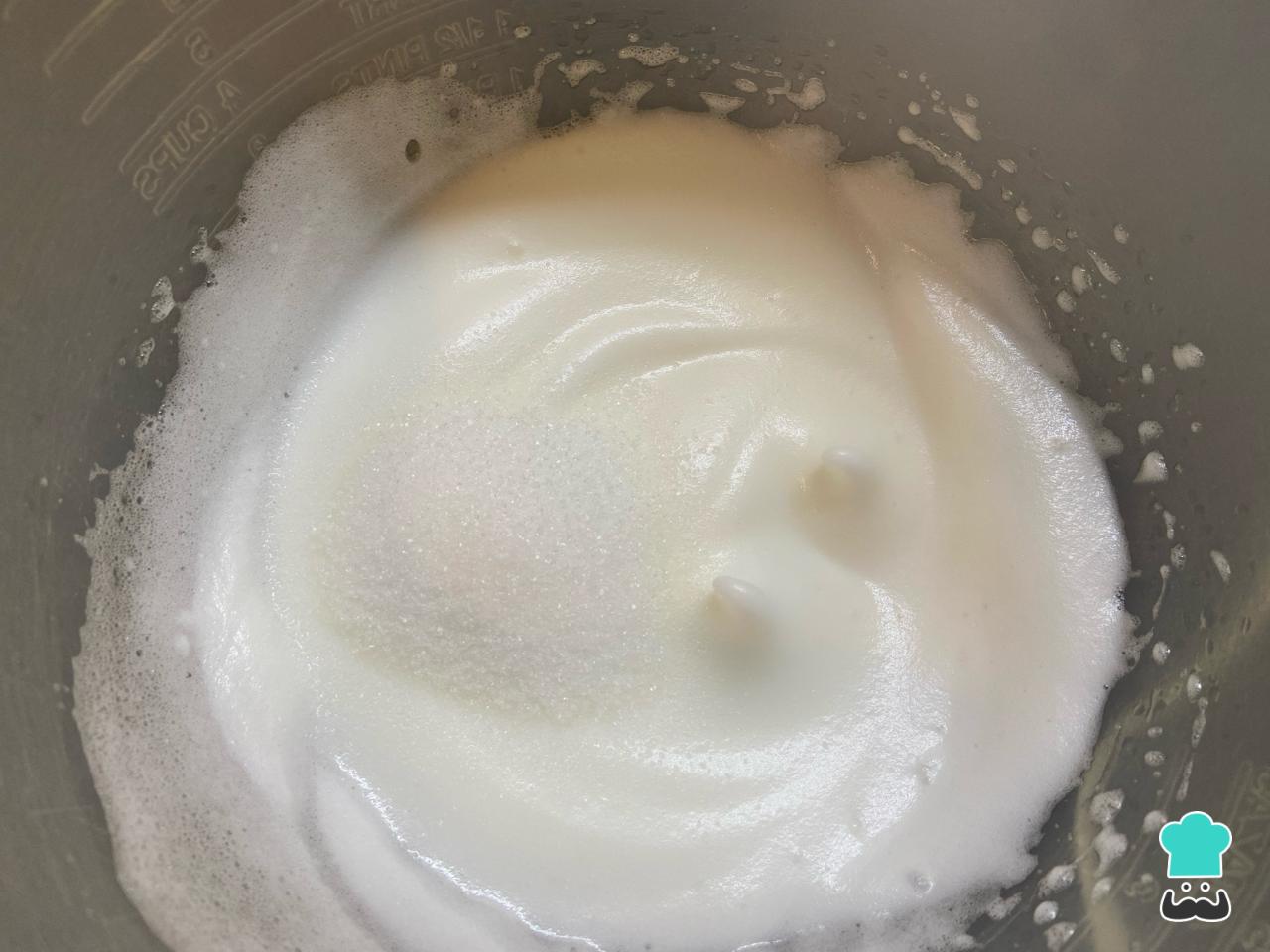 Bate las claras hasta obtener un punto nieve, es decir, cuando las claras estén firmes, como ves en la foto.