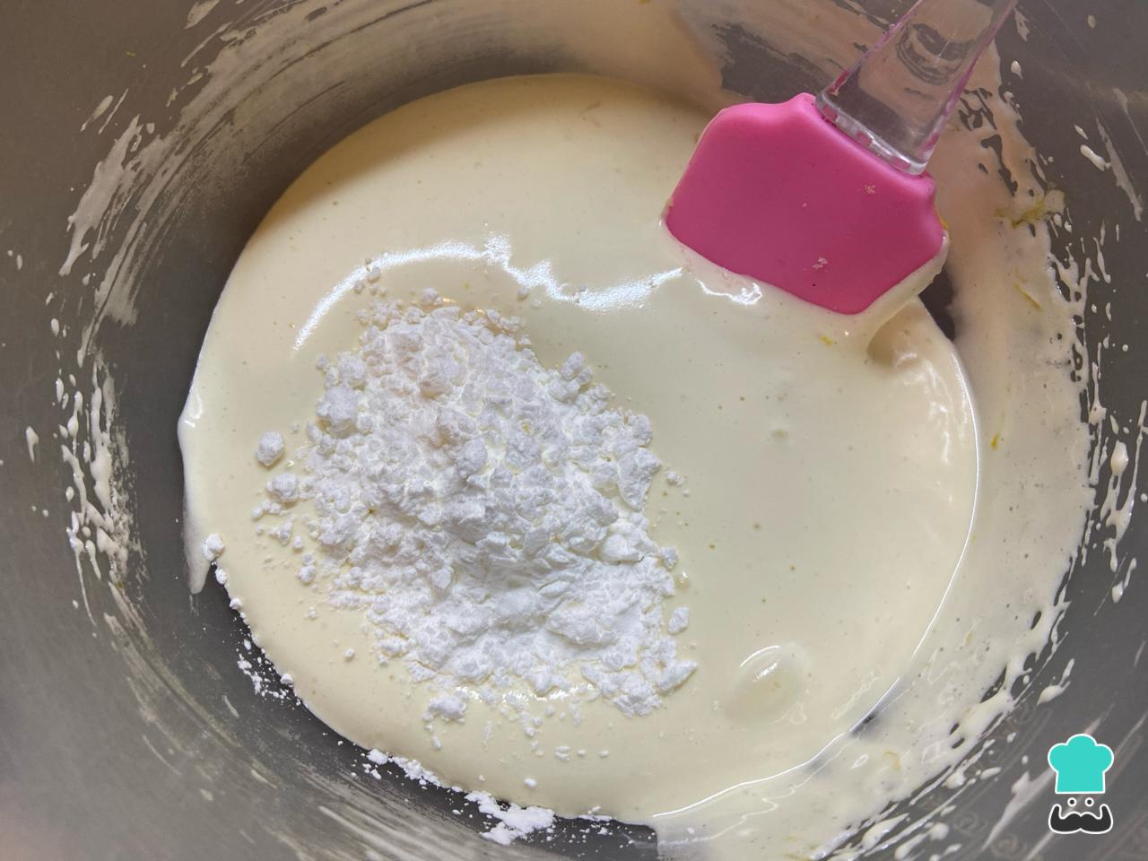 Solo resta incorporar la maicena. Hazlo poco a poco y en 3 partes y, cuando se haya integrado una parte, añade la siguiente. Utiliza una espátula y realiza movimientos envolventes para conservar el aire que incorporamos en el batido.