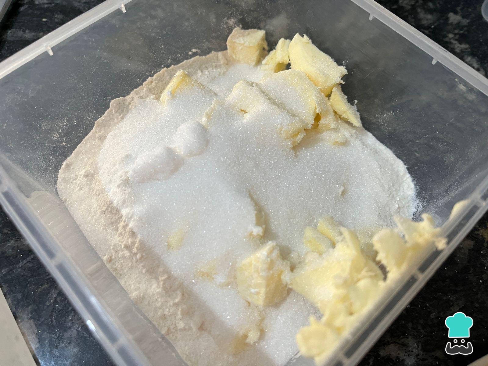 Para empezar con la preparación de la torta de ricota alemana, en un recipiente mezcla la harina con la pizca de sal, el polvo para hornear, el azúcar y la manteca fría cortada en cubos. Desgrana con ayuda de las yemas de tus dedos.