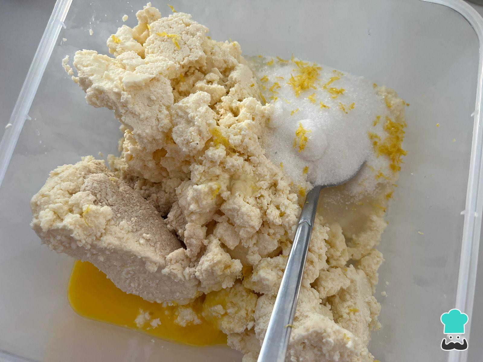 Mezcla la yema con la ricota, el azúcar, la esencia de vainilla y la ralladura de limón.