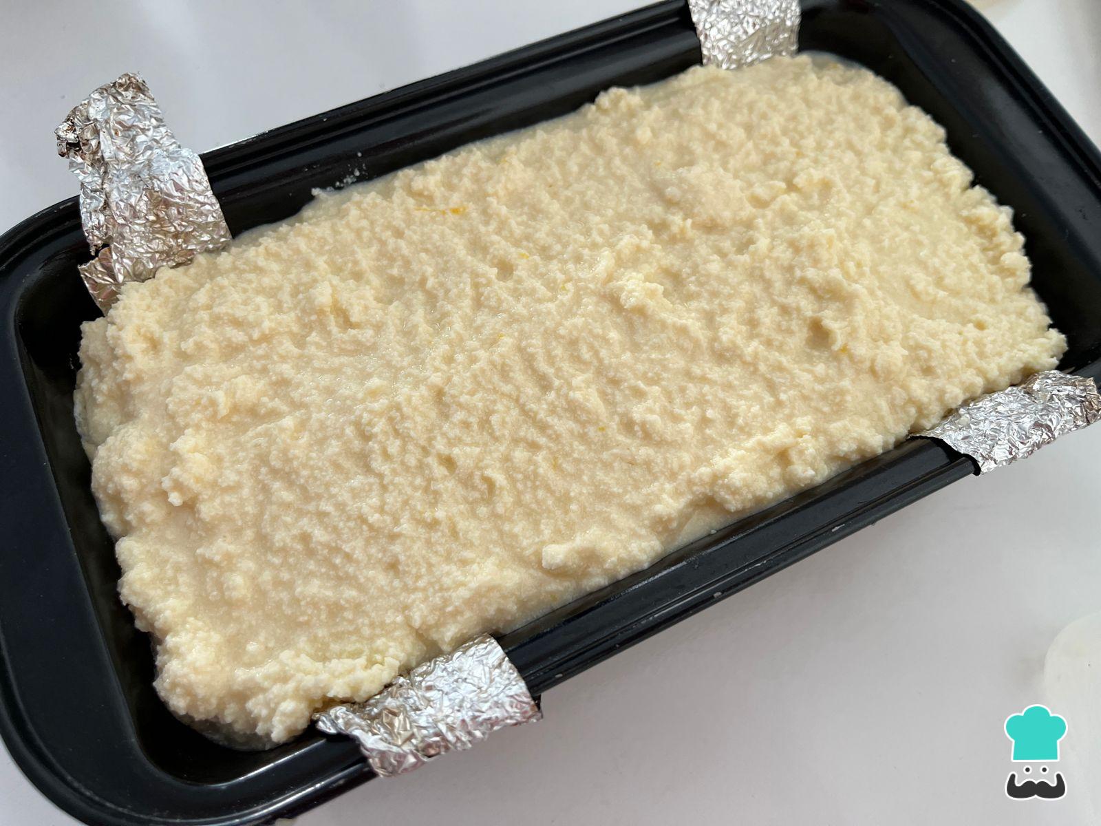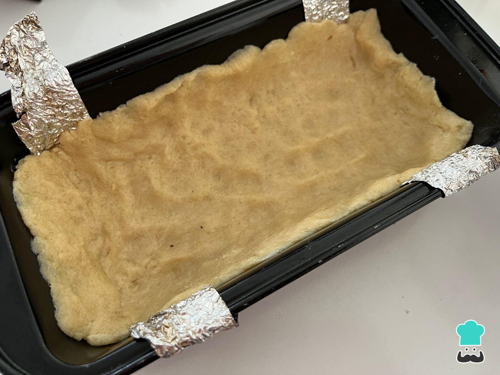 Prepara el molde con unas tiras de papel aluminio o manteca para poder desmoldar tu torta fácilmente. En este caso, usamos un molde de 26x12, pero puedes usar uno redondeo de aproximadamente 20 centímetros de diámetro. Úntalo con aceite y cubre la base con la masa que reposamos anteriormente.