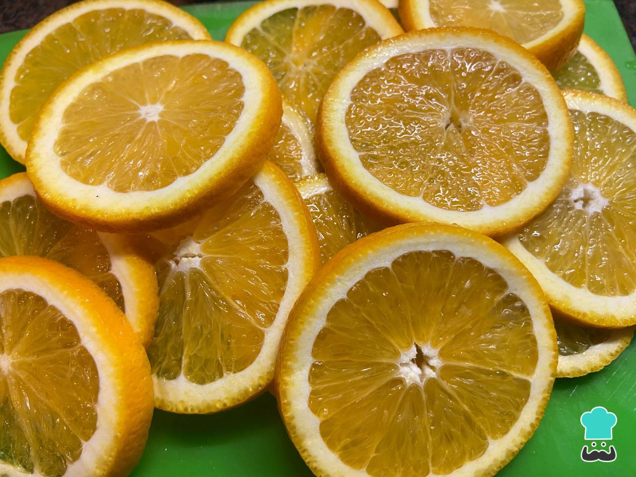 Comienza lavando muy bien las naranjas. Luego, córtalas en rodajas muy finas de aproximadamente 4 mm. Retira las semillas si las tuviera.