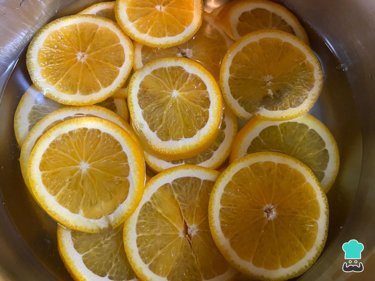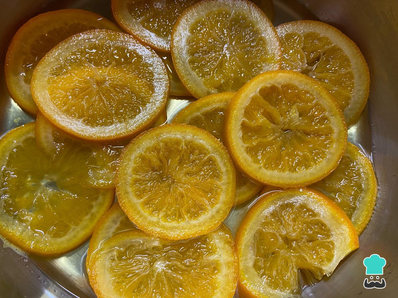 Coloca en la olla 600 cc de agua junto con 200 gr de azúcar. Lleva al fuego y revuelve hasta disolver todos los cristales de azúcar. A continuación, añade las rodajas de naranja y espera a que hierva. Luego, baja el fuego bajo y deja cocinar hasta que se pongan transparentes. Apaga el fuego y deja enfriar.