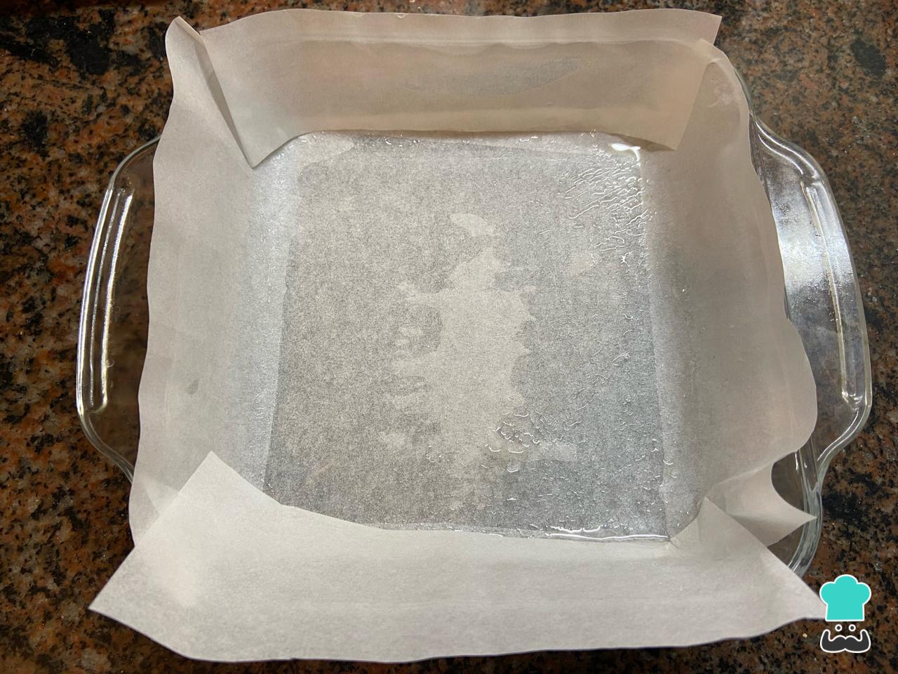 Unta el molde con aceite o manteca. Luego, cubre completamente con papel manteca y vuelve a engrasar con manteca o aceite. Enciende el horno para precalentar a 180 °C.