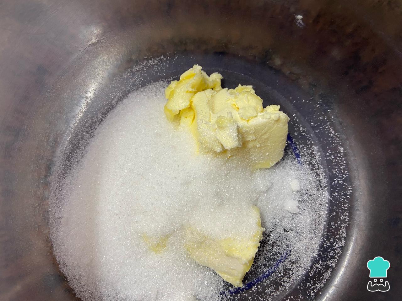 Para el bizcocho, coloca en un bol la manteca pomada junto con el azúcar. Bate hasta formar una especie de crema.