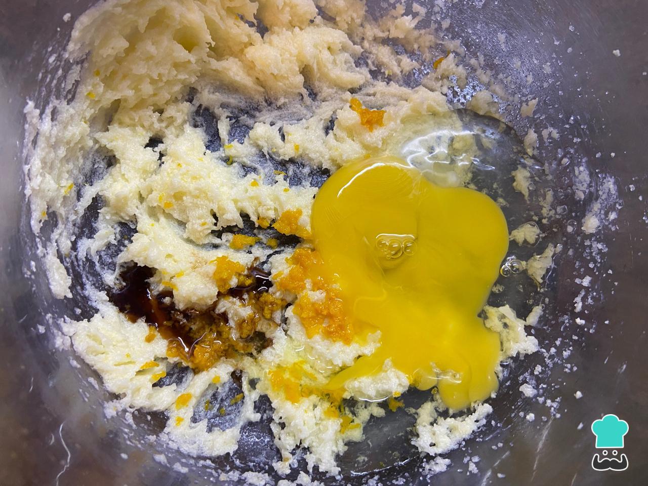 Añade el huevo, la esencia de vainilla y la ralladura de naranja. Vuelve a batir unos minutos.