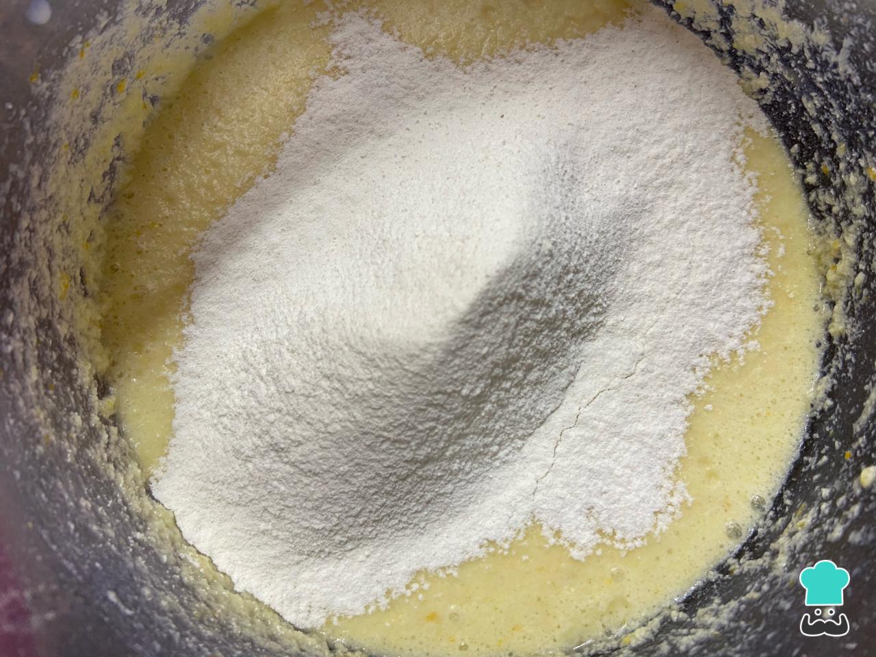 Incorpora el jugo de naranja y la mitad de la harina tamizada junto con el polvo para hornear. Integra con la batidora. Luego, añade el resto de la harina e integra con batidor de mano o espátula realizando movimientos envolventes.