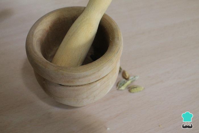 Abrimos las vainas de cardamomo y ponemos las semillas en un mortero. Machacamos finamente.