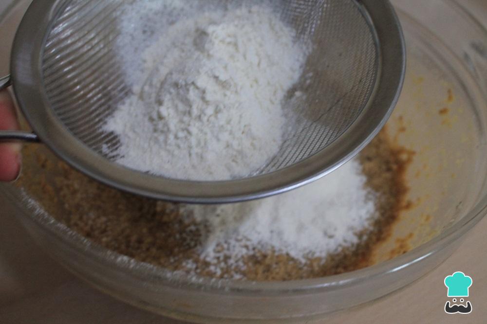 Mezclamos la harina junto con la levadura (polvos de hornear) y la sal. Tamizamos encima de la mezcla y removemos todo bien.