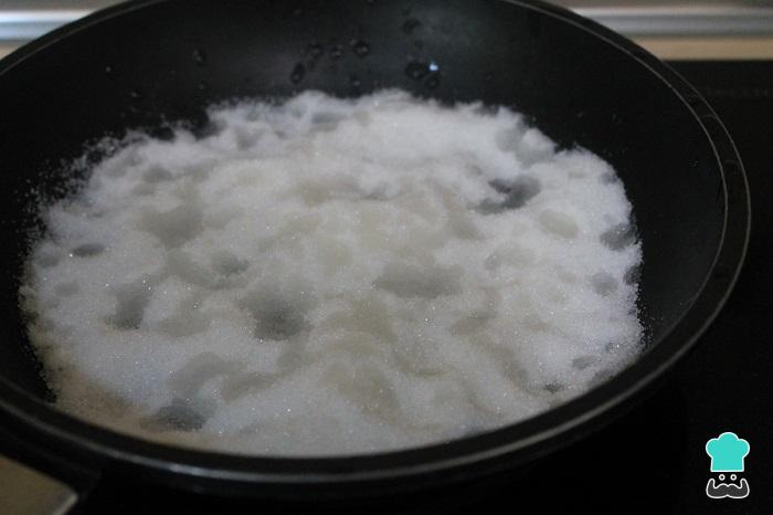 Precalentamos el horno a 180 ºC. Ponemos en una sartén el azúcar con unas gotas de agua y hacemos un caramelo con ella.