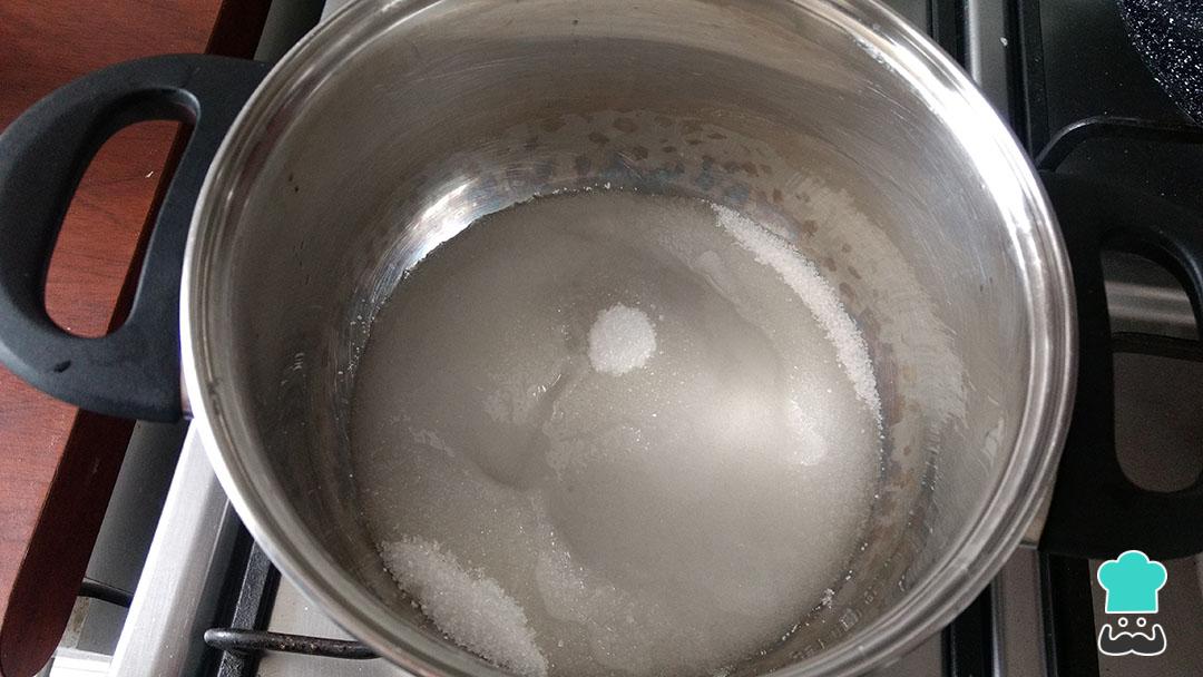 Precalienta el horno a 180 ºC, aproximadamente. Empieza a hacer el caramelo líquido. Derrite el azúcar en una olla con las cucharadas de agua a fuego medio-alto. No lo revuelvas para que el azúcar no se cristalice.