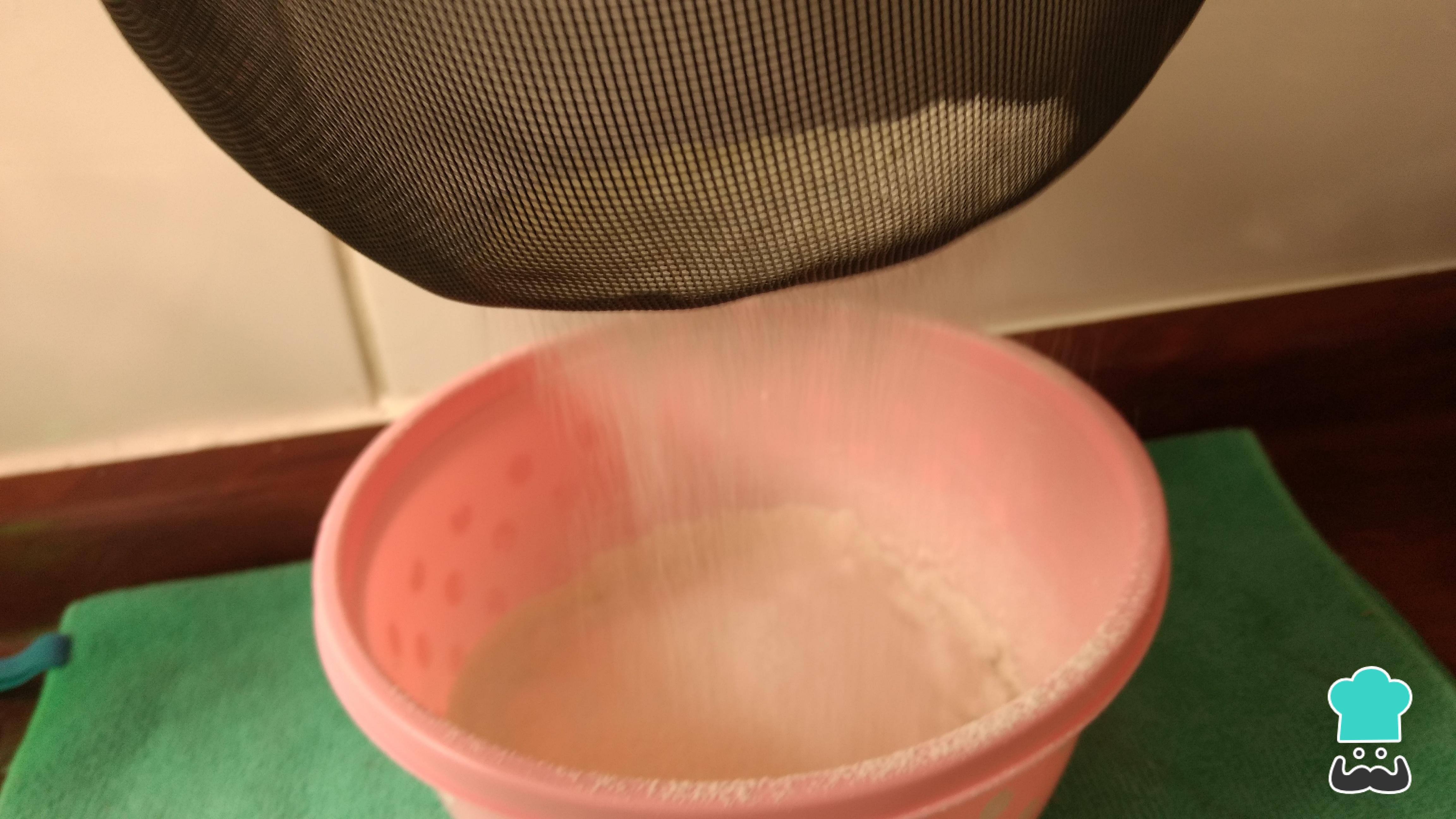 Ahora podrás preparar la mezcla del bizcocho esponjoso. Cierne la harina y los polvos de hornear en un bol grande. Si usas sal, agrégala en este paso también.