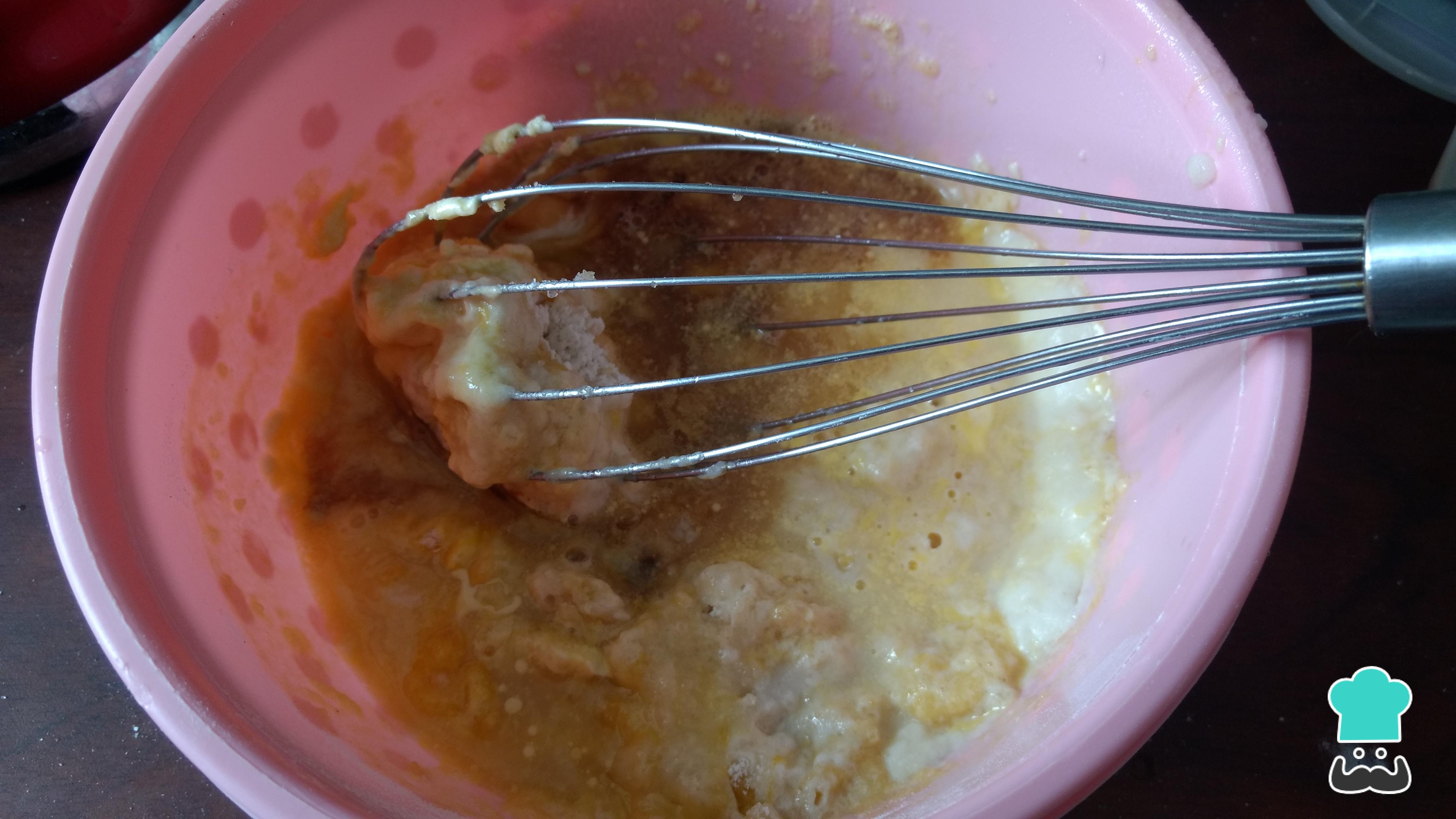Mezcla todo los ingredientes húmedos con los secos. Vierte la mezcla en el recipiente con el caramelo.