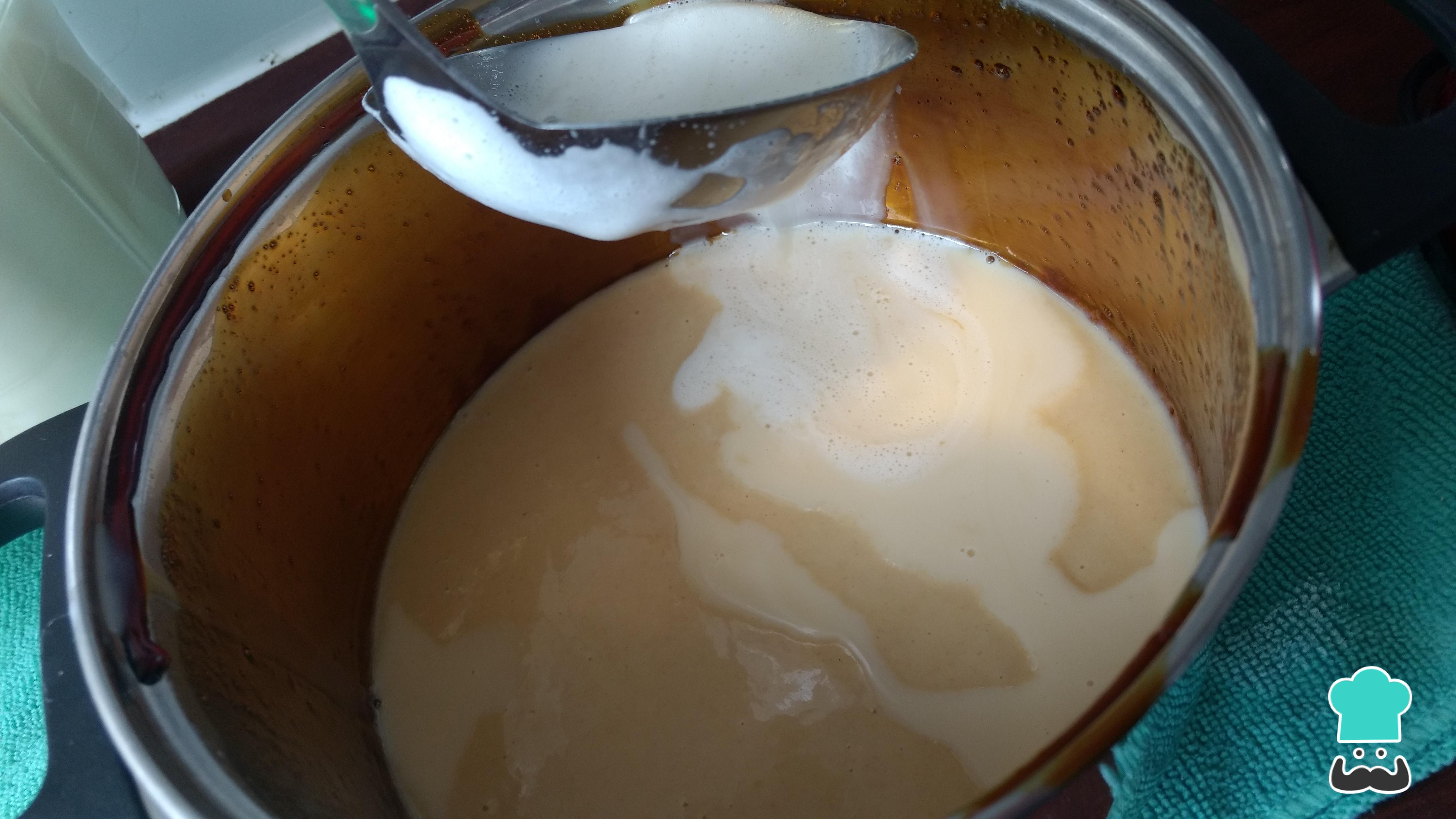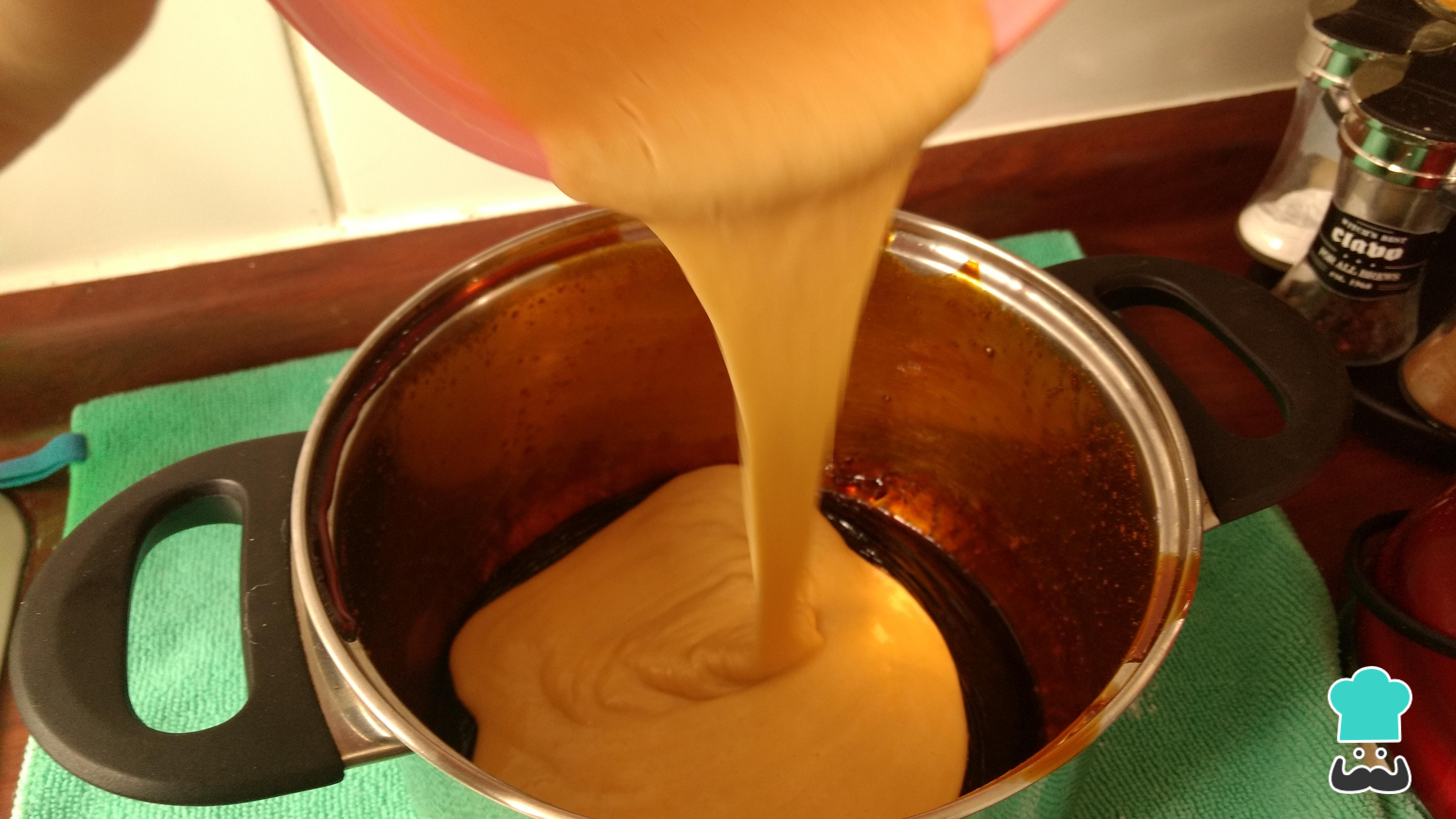 Si utilizaste una olla, vierte el caramelo en el molde mientras aún está caliente y líquido, con mucho cuidado cubre el fondo y las paredes del molde. Reserva.