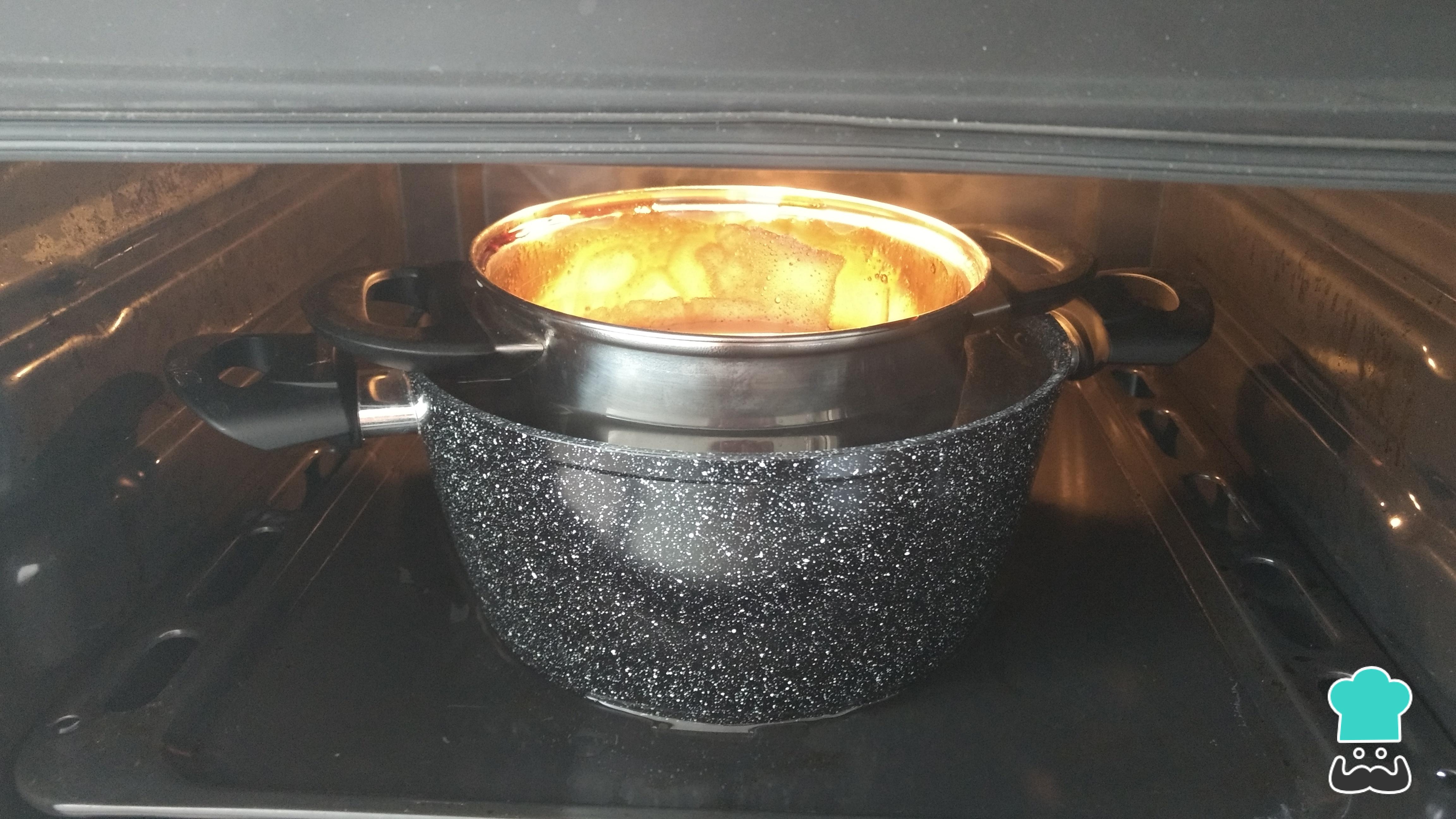 Hornea preferiblemente a baño María. Para hacerlo, solo coloca el molde dentro de un recipiente más grande con agua hirviendo. Cocinapor 1 hora y 35 minutos a 180 ºC. Para saber si tu torta quesillo sencilla está lista, solo debes insertar una varilla o cuchillo en el centro. Si sale limpio es que está lista.
