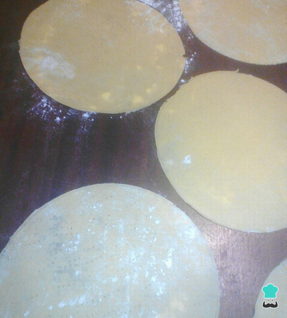 Separar en 12 bollitos y estirar, cada bollito. Cortar con disco redondo.