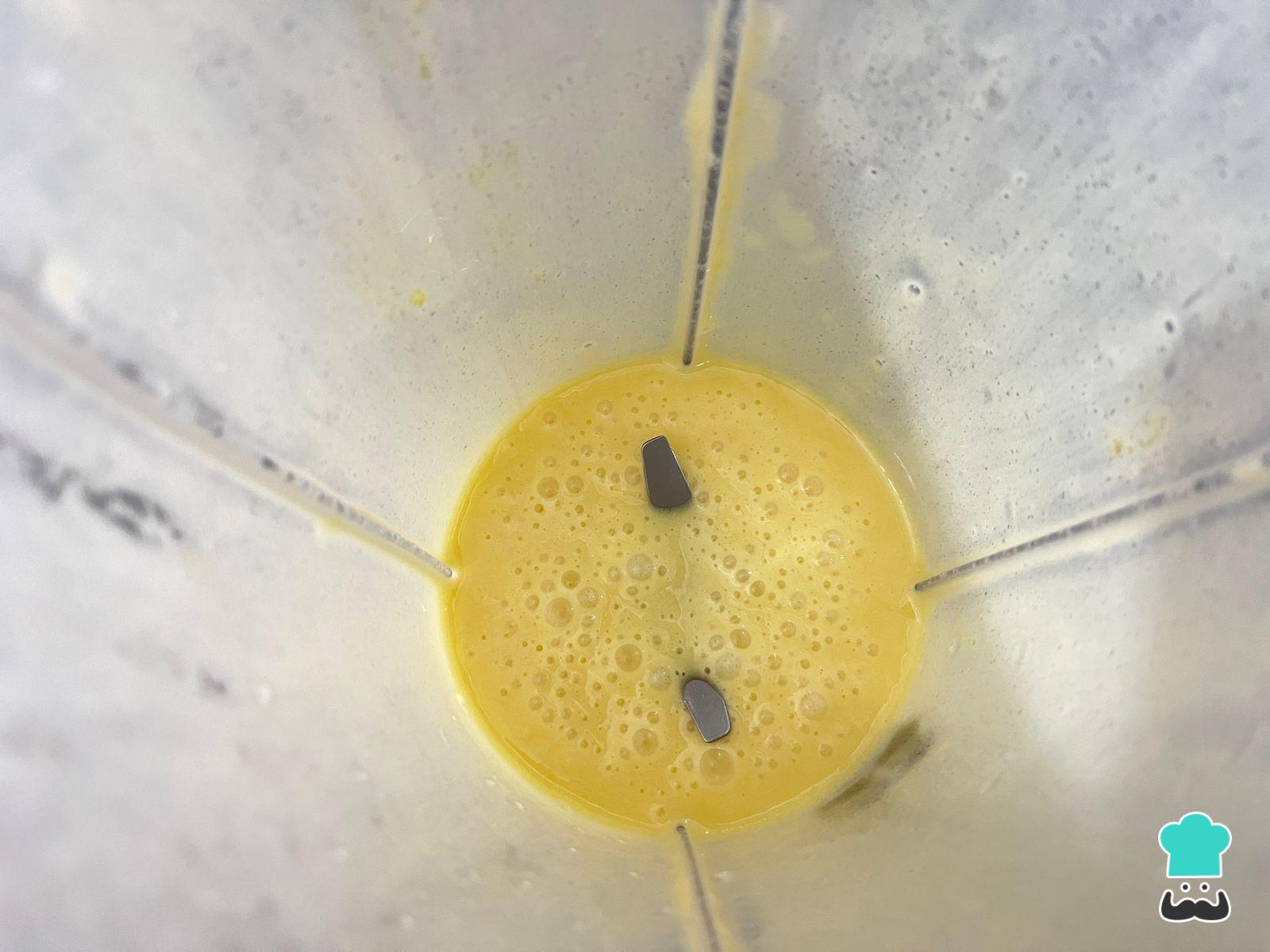El primer paso para hacer esta torta o bizcochuelo con aceite consiste en batir el huevo a temperatura ambiente con la pizca de sal y el azúcar hasta que tome un color blanquecino y esté bien esponjoso. Luego, añade el aceite y el jugo de limón y continúa batiendo para que se emulsione. Si no deseas usar jugo de limón, puedes reemplazarlo por jugo de naranja o agua. Si deseas que tenga un sabor más intenso a limón, puedes agregar ralladura.