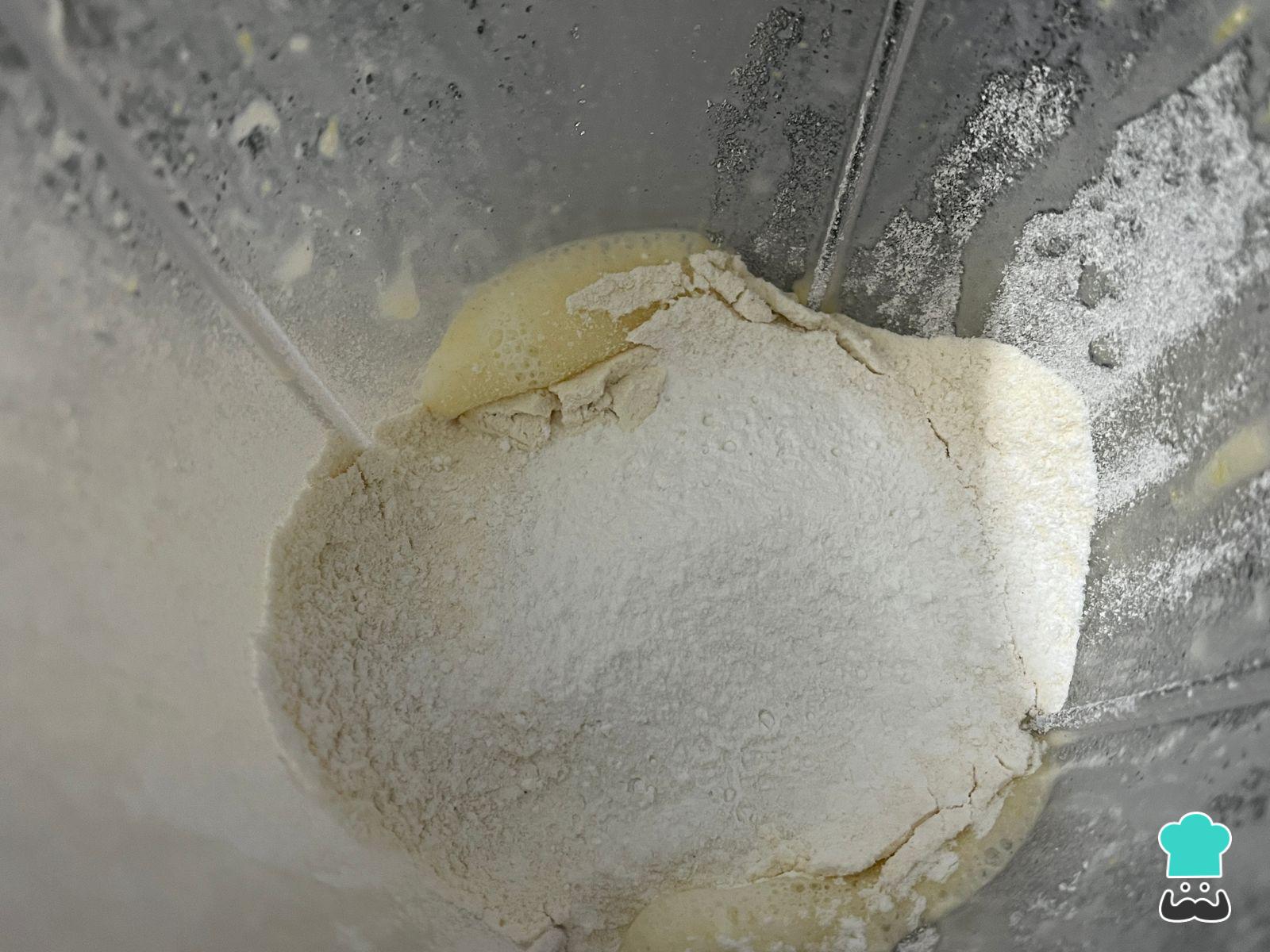 Agrega la mitad de la harina e integra con movimientos envolventes o unos toques de licuadora y, luego, la mitad restante. No sobrebatas el líquido con las harinas porque el resultado será un bizcocho duro.