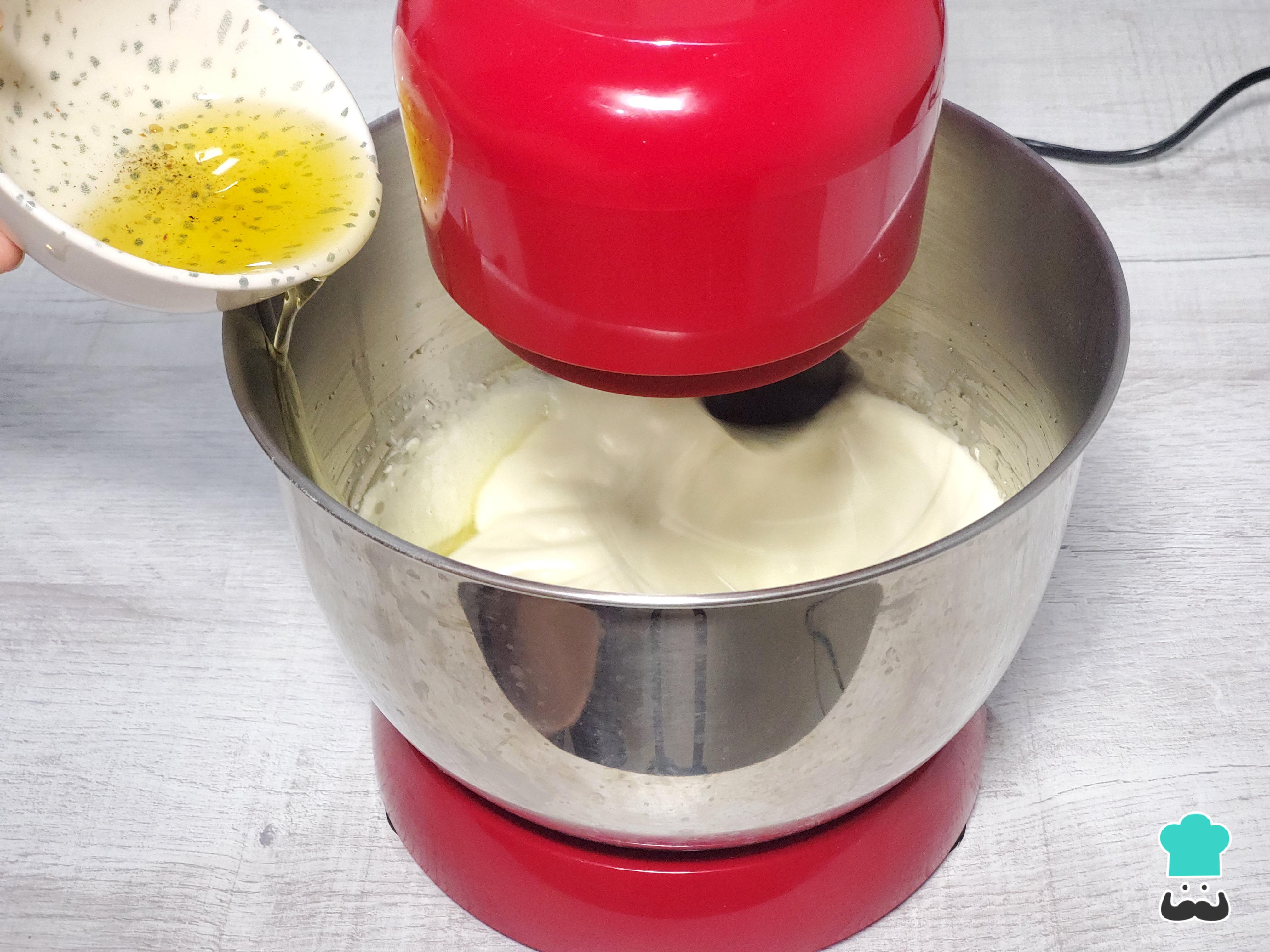 Sin dejar de batir, incorpora el aceite en forma de hilo a velocidad media. Este paso es crucial para emulsionar correctamente y lograr una textura perfecta. Continúa batiendo durante 1 minuto más para integrarlo completamente a la mezcla.