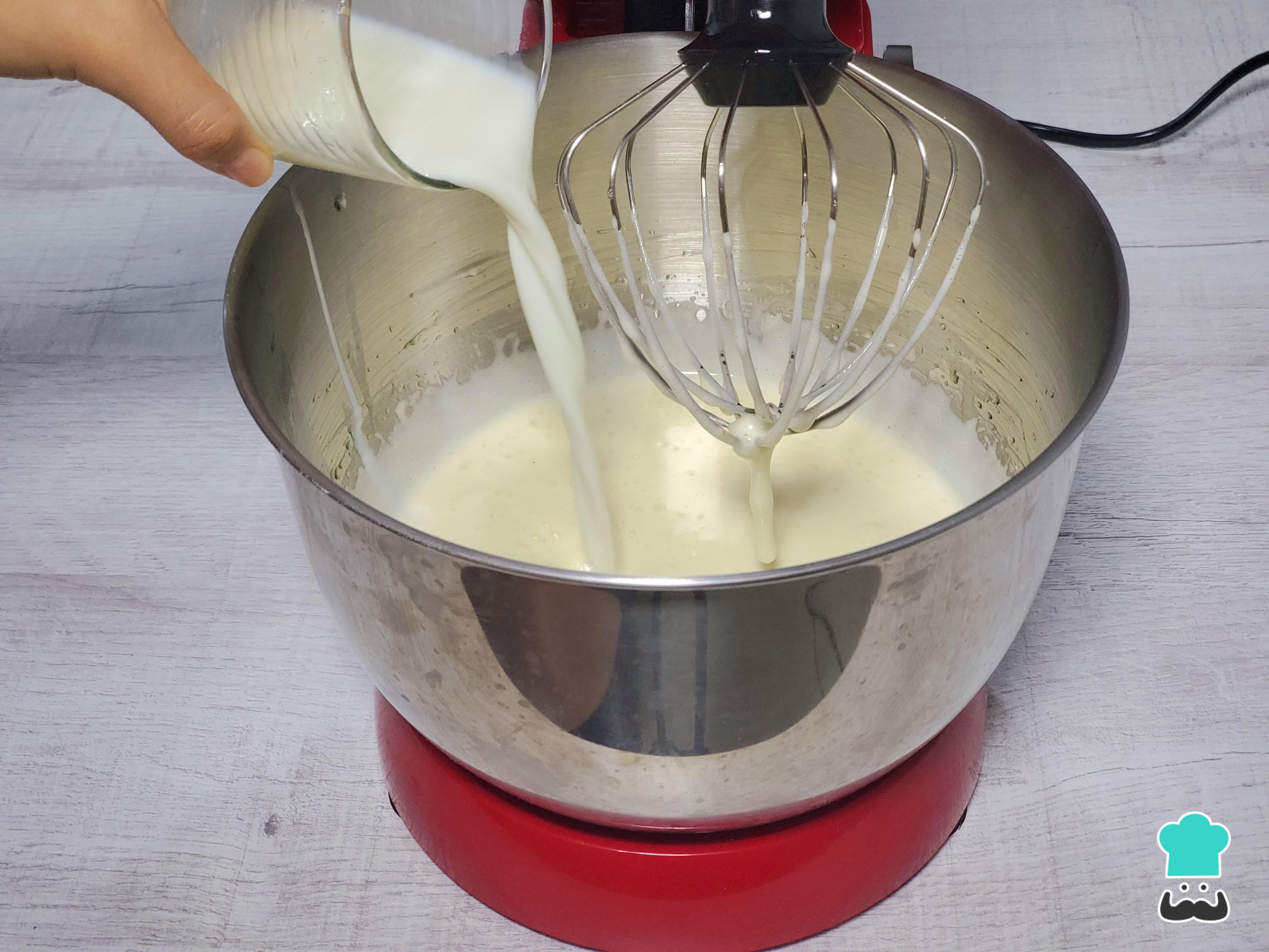Vierte la mitad de la leche a temperatura ambiente y continúa mezclando hasta integrarla por completo. En este momento puedes añadir la esencia de vainilla para aromatizar tu torta casera esponjosa y suave.