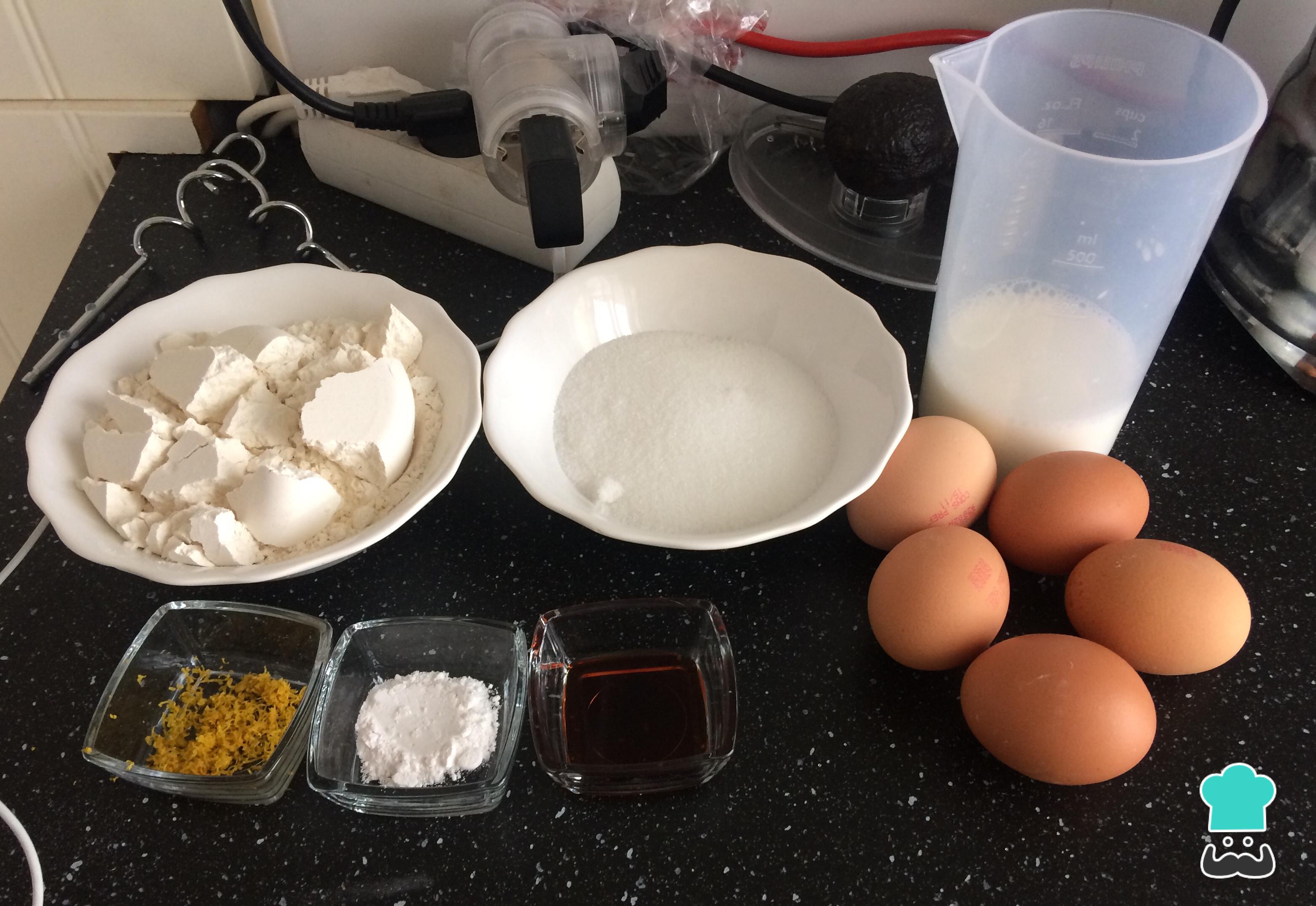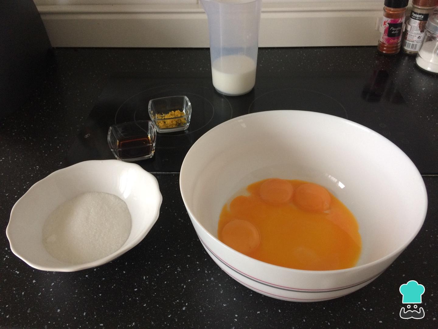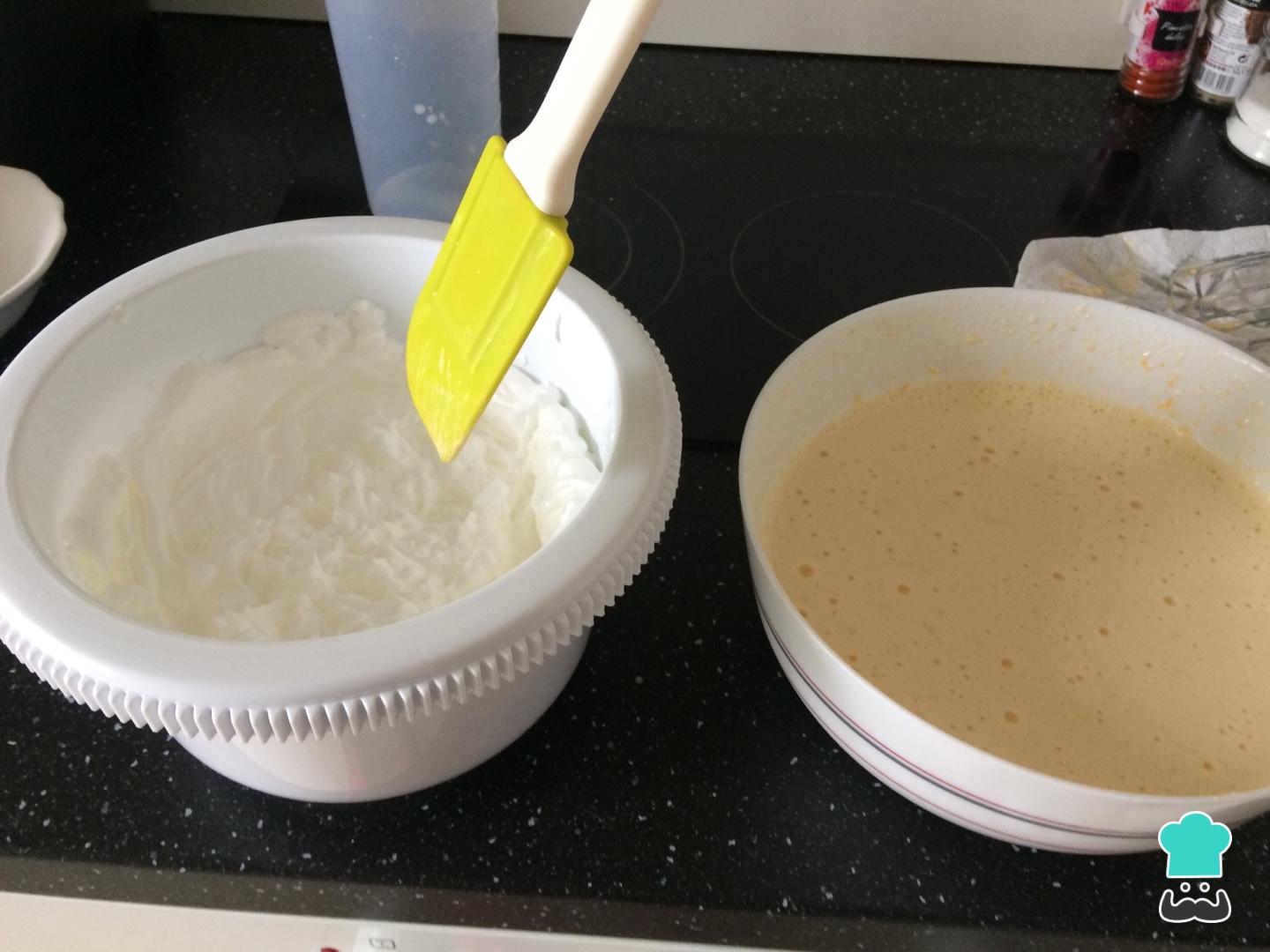 Con las yemas, batimos unos minutos hasta que se blanqueen, añadimos el resto del azúcar, la esencia de vainilla y la ralladura de limón, y seguimos batiendo otros 3 minutos. Cuando suban de volumen, añadir la leche y batir hasta incorporar todo el resto de los ingredientes. Precalentar el horno a 180 grados.