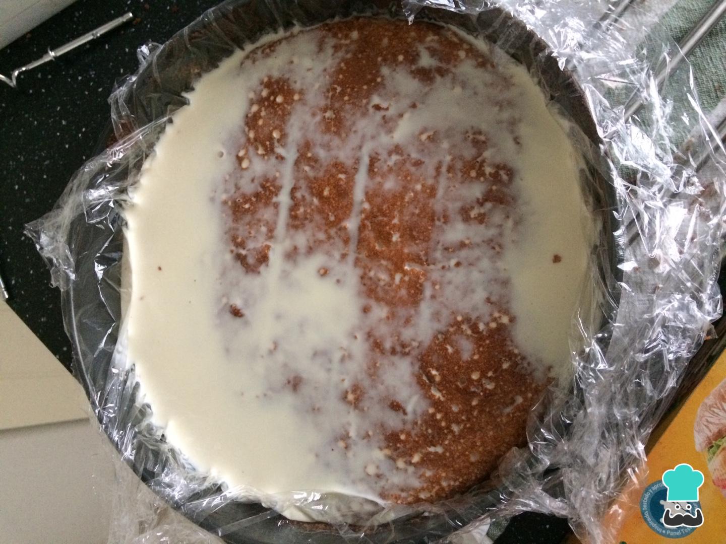 En el mismo molde que hicimos la tarta, si es hermético os podéis saltar el paso, y los que como yo no tienen cubrir el molde con papel film para que la salsa no riegue, pinchar todo el bizcocho y esparcir la salsa, cubrirlo y reservar toda la noche.