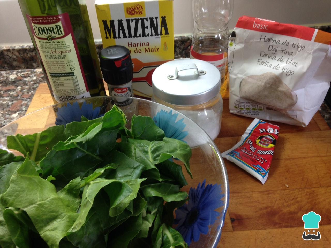 Aquí tenemos los ingredientes para preparar esta tortilla vegana. De las acelgas descartaremos los tallos. También puedes sustituir la harina de trigo por harina de garbanzos.