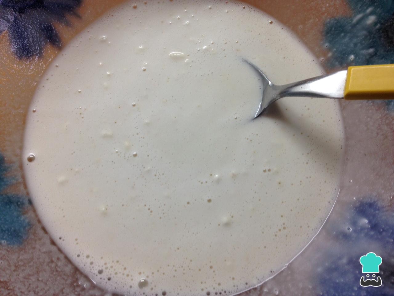 Mientras se cuecen las acelgas, preparamos la mezcla de harinas, que con un poco de agua actuará igual que el huevo de una tortilla. Mezclamos la harina de trigo con la harina de maíz y el medio sobre de levadura. Calentamos el vaso de agua en el microondas y vamos vertiendo agua sobre la mezcla de harinas mientras removemos. Buscamos una textura similar a la del huevo batido. Cuando lo tengamos, añadimos un chorrito de vinagre.