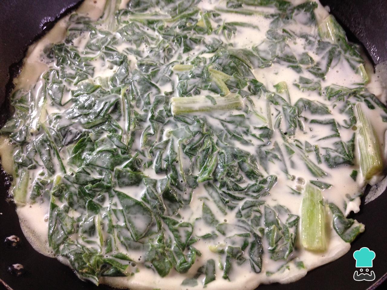 Cuando la tortilla de acelgas esté cocida por debajo, podemos doblarla sobre sí misma para facilitar el giro de la tortilla. Con unos pocos minutos más ya estará lista.