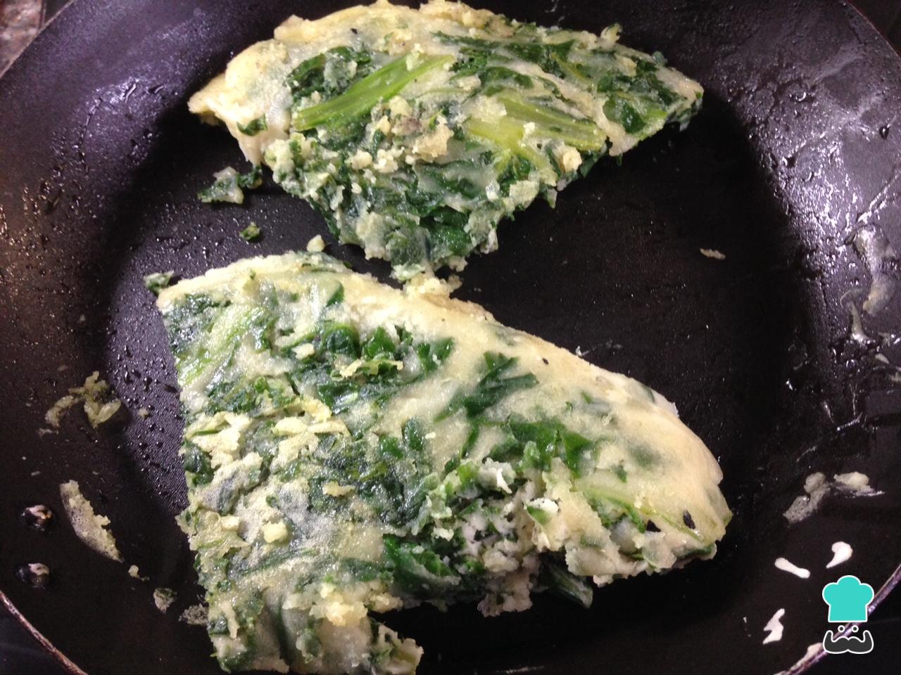 Incorporamos las acelgas cocidas a la mezcla de harinas y salpimentamos. Mezclamos bien y vertemos la mezcla en una sartén con un poco de aceite caliente, para elaborar ya la tortilla sin huevo.