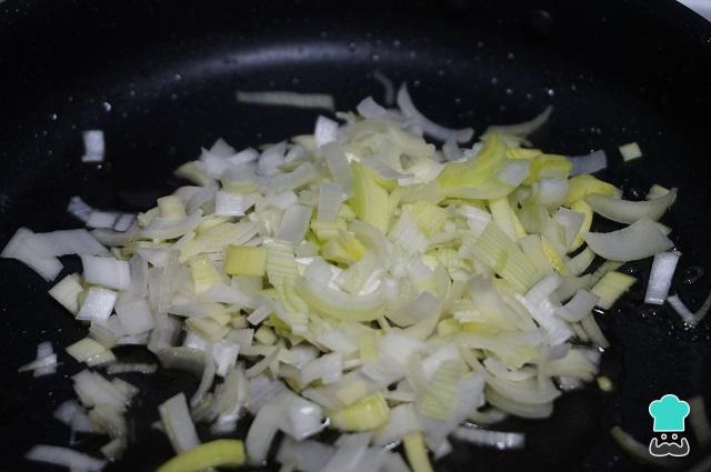 Para empezar con la receta de tortilla de calabaza, primero lavamos y picamos el puerro. Ponemos una sartén con un chorro de aceite y, cuando esté caliente, pochamos el puerro sin que llegue a dorarse.