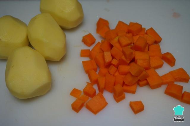 - Lavamos y troceamos las patatas y la calabaza en trozos del mismo tamaño.