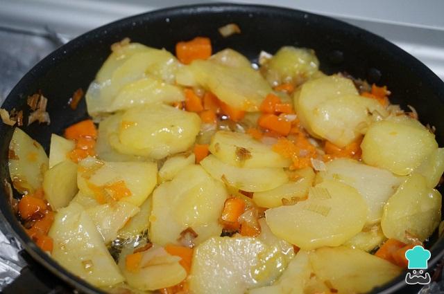 Incorporamos las patatas y la calabaza a la sartén junto al puerro. Lo dejamos que se haga todo junto hasta que queden las patatas y la calabaza tiernas.