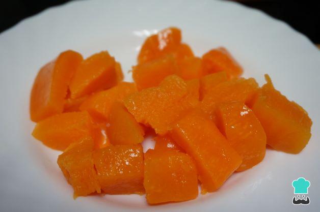 Para empezar con la receta de tortilla de calabaza y cebolla, primero prepara la calabaza. Para ello, pélala y córtala en trozos pequeños. A continuación, colócala en un bol apto para microondas, cubre con film transparente e introduce en el microondas 4-5 minutos a máxima potencia. Reserva.