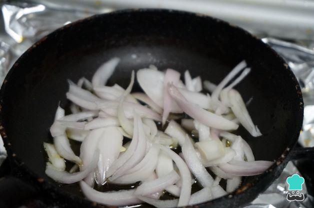 Pela y pica una cebolla en trozos pequeños o en tiras. A continuación, coloca una sartén con un chorro de aceite de oliva e incorpora la cebolla, deja pochar hasta que adquiera un poco de color.